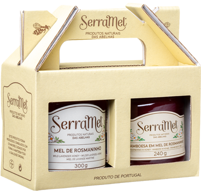 Esta embalagem inclui um frasco de Mel de Rosmarinho Serramel e um frasco de Framboesa em Mel. Uma excelente oferta para apreciadores de produtos naturais.